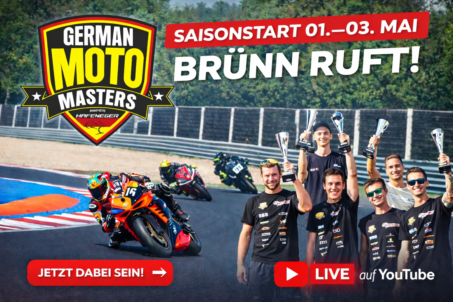🏁 Saisonstart German Moto Masters 2026 – Brünn ruft! Am 01.–03. Mai ist es endlich so weit: Die neue Saison der German Moto Masters startet auf dem traditionsreichen Automotodrom Brno – und verspricht direkt zum Auftakt packenden Rennsport. Nach der langen Winterpause treffen sich Fahrerinnen und Fahrer der Klassen GMM